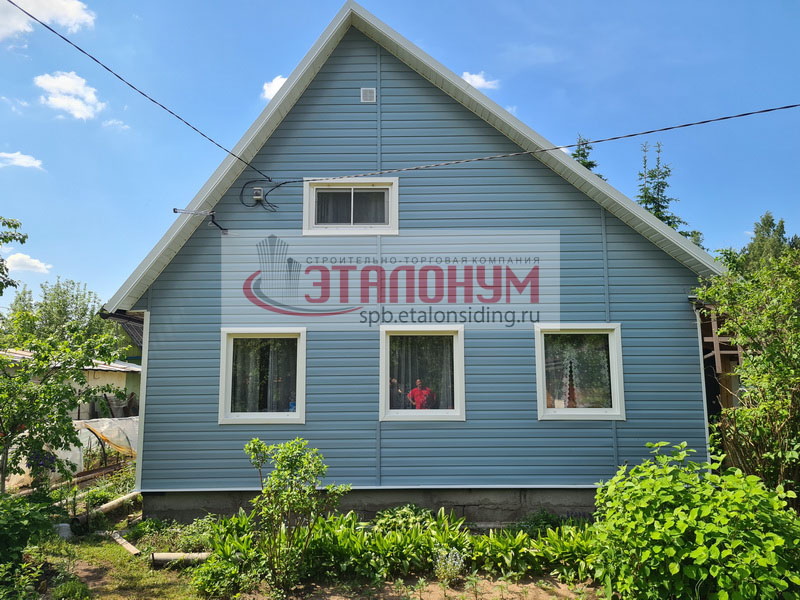 Для обшивки заказчик выбрал сайдинг Деке Премиум Корабельный брус, цвет Голубика с белыми аксессуарами, а цоколь решил не обшивать.